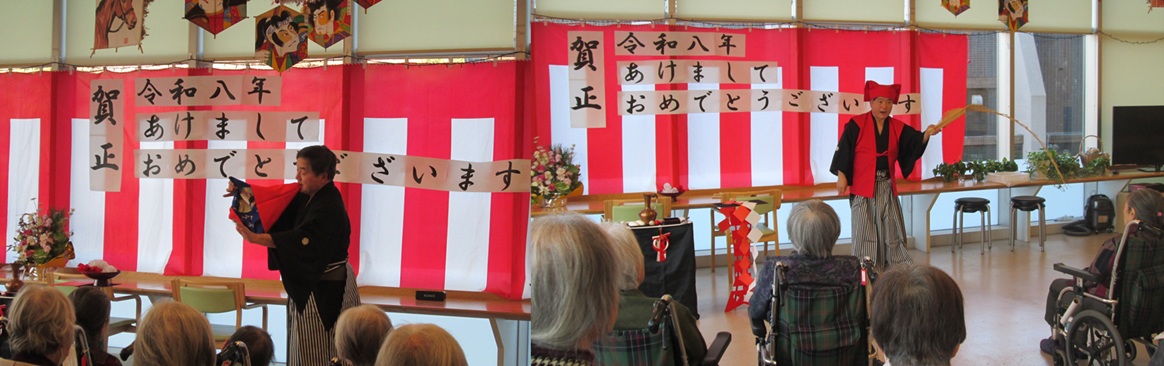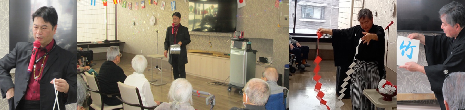 新春ということで着物と袴で実演、南京玉すだれは最後に長く伸びた時、どのフロアーでも歓声が沸きました。皆さん穏やかに見守ってくださいました。