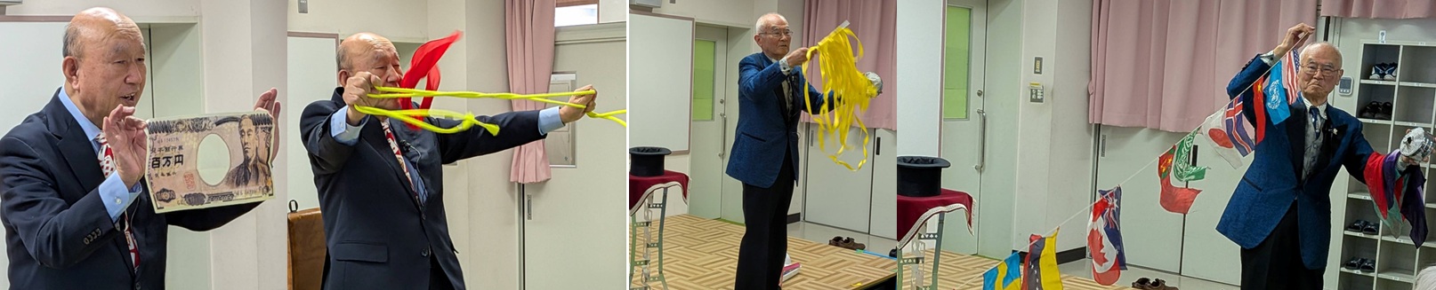牧原会員:紅白ロープのマジック、紅白の紙を切ってつなげるマジック、南京玉すだれなど