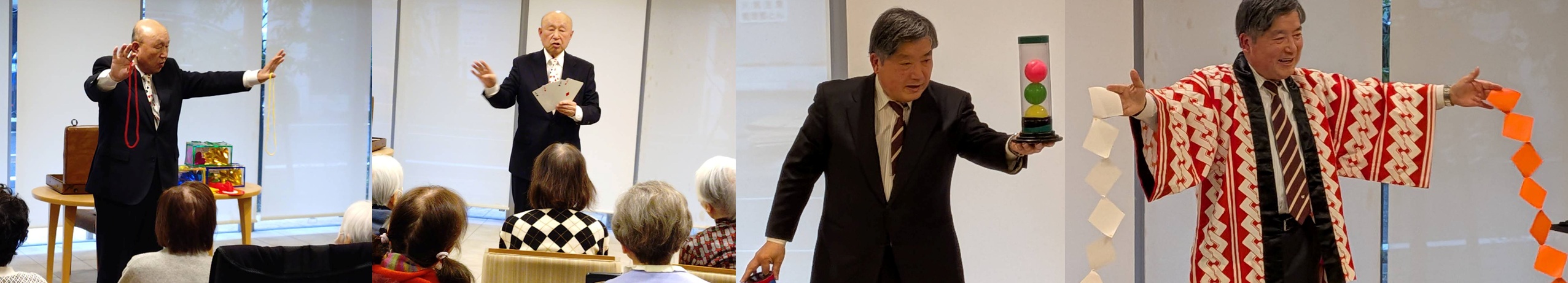 演目は3か所いずれも同じ内容です。扇子の色変わり、大きくなるシルクのハンカチ、袖から玉子の出現、つながる紙、箱からハンカチの出現、南京玉すだれ 等